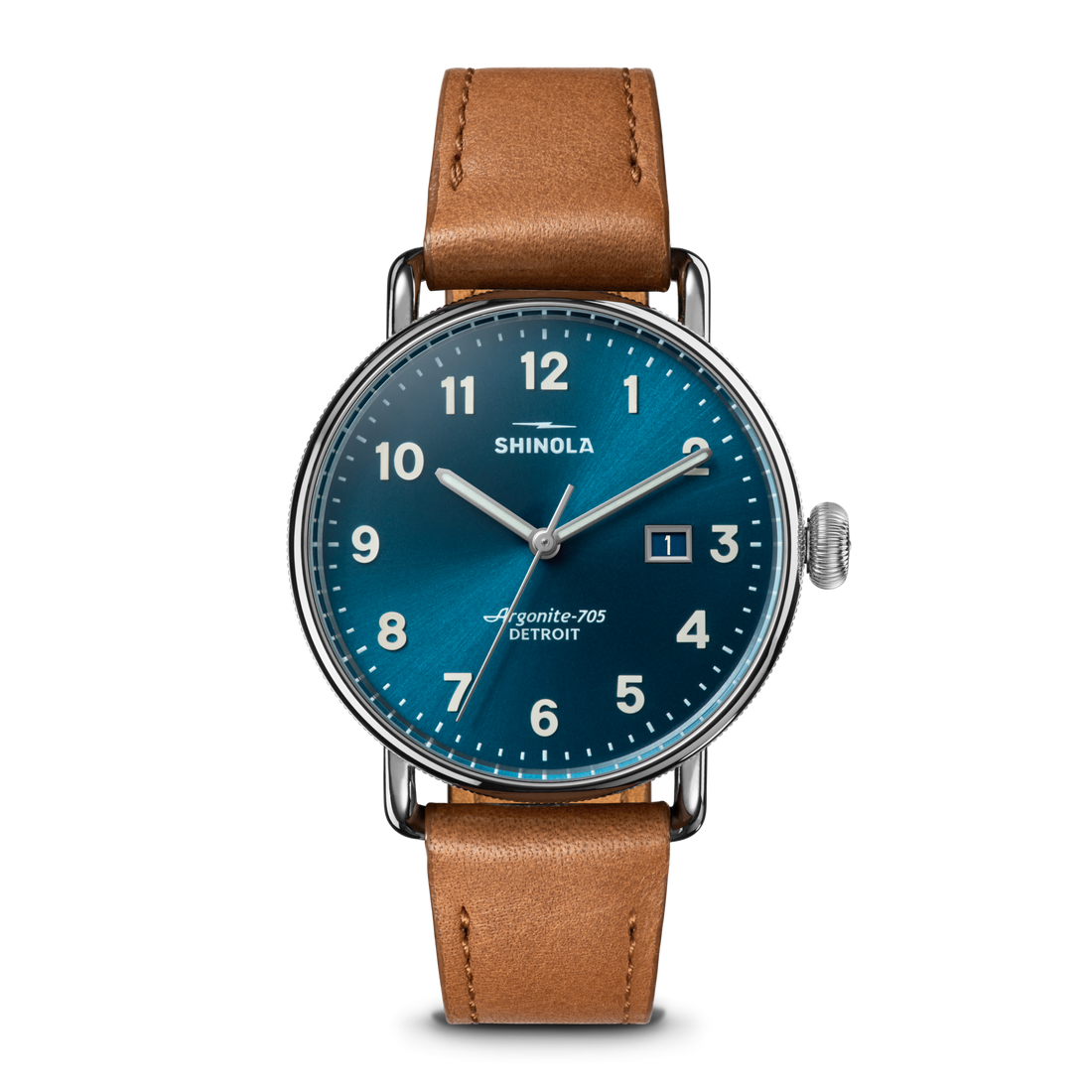 The clean, classic and modern delight that’s guaranteed to strike up a conversation, scaled down to a fresh 38MM cool astro blue dial is a pleasure, with an open minimalist face made possible by the timepiece’s top loaded case construction. Slim, diamond-cut hands and the calendar aperture are powered by the Detroit-assembled Argonite 705 movement. It’s all brought together by the classic stainless steel case and a tan leather strap—the perfect complement to any polished, sophisticated outfit.