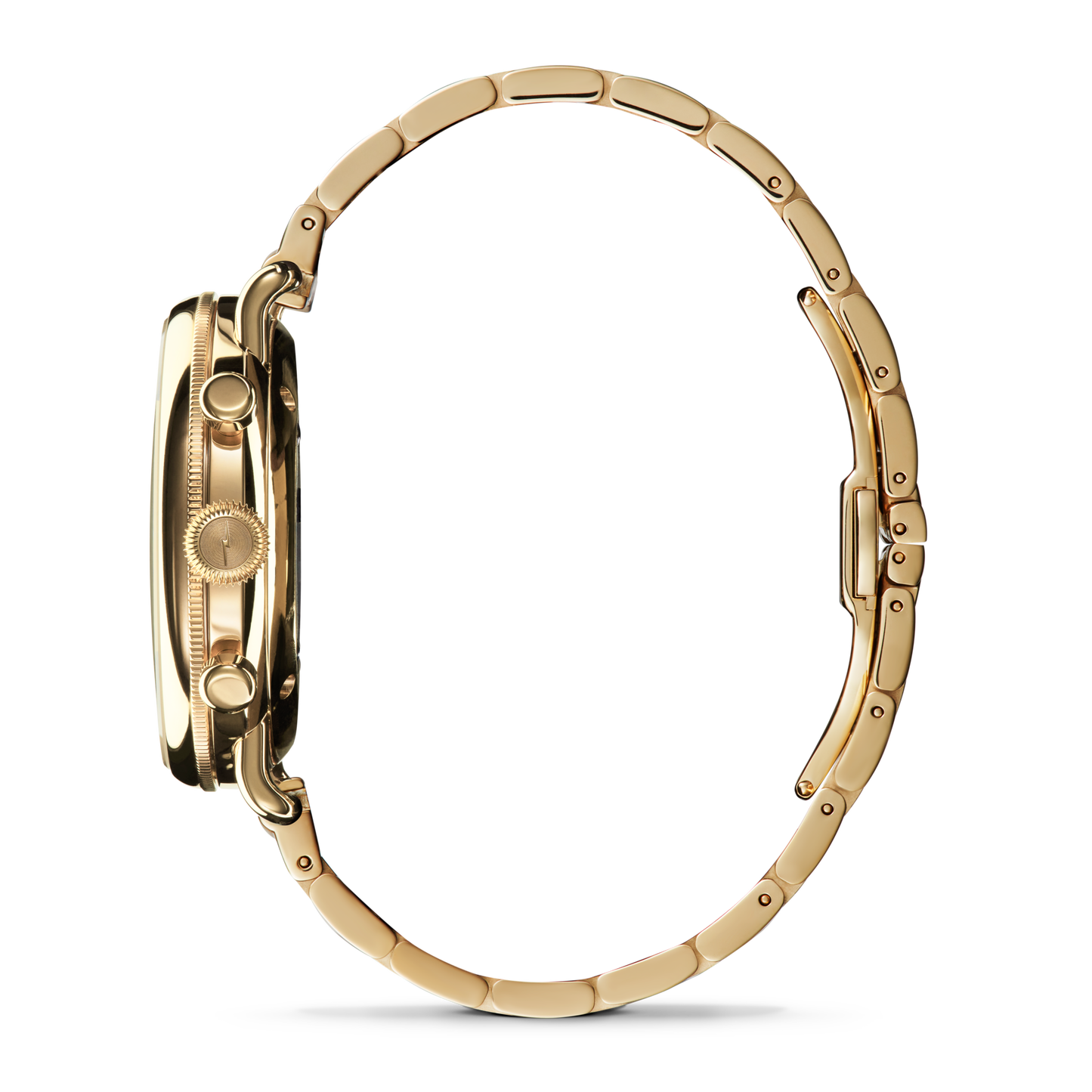 Built using top loaded case construction, the Canfield Chronograph features an open white dial that showcases refined minute track and slim, diamond-cut hands. Finished with PVD gold stainless steel case and bracelet, this is sophistication achieved through simplicity.